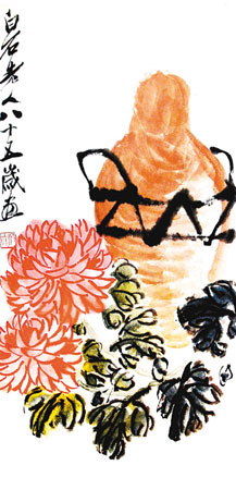 《菊酒圖》鮮明體現(xiàn)了白石老人“紅花墨葉”的花鳥畫風格。畫中一叢秋菊,一壇老酒,構圖簡約;^以牡丹紅勾勒而出,與酒壇的赭石色一起構成了明艷熱烈的主色調,渲染了豐收后喜悅的情緒。此畫艷而不俗的關鍵,在于其用筆勁健生辣,不失文人畫的筆墨傳統(tǒng)。同時菊葉、酒筐及題款都是黑重色,對主色調進行了有效的制衡,使畫面顯得富麗而穩(wěn)重,韻味無窮。