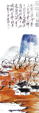 白石老人以花鳥創(chuàng)作為主,但也偶作山水,并能把花鳥畫的一些技法運用到山水畫中,別有清新明快之感。《羅浮覓句圖》是一幅精彩的山水畫作品,此作取全景式構圖,布局宏大:遠處羅浮山巍峨聳立,設色單純明快,虛實相映,凸顯空間之感;山下赭色的坡地上則是梅林如海,白梅綻放,梅香陣陣;林中屋舍隱顯,高士攜童覓詩;近景水波微瀾,渡頭空曠,具有濃郁的文人情懷。該畫的技法簡捷,沒有傳統(tǒng)山水畫的“勾、皴、染、點”的繁復創(chuàng)作程式,而是以大寫意手法縱筆平涂,別具簡約質樸的生活情趣。在色彩上,大片泥土的赭石紅,也與遠山淺藍綠的花青色形成鮮明對比,顯得非常精神。題詩“風寒冬深無夢來,相尋曾記那年栽;定是羅浮舊蜨仙,萬千如雪向我開”,詩畫相配,令人心馳。