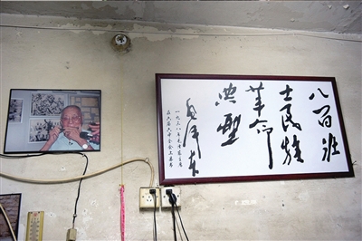 王家將靈堂設(shè)在老人臥室之中,不大的臥室里擺放著網(wǎng)友送來的花圈,挽聯(lián)上寫著“沉痛悼念抗日英雄王文川先生”。老人的遺像安放在靈堂正中,遺像中的老人戴著眼鏡神態(tài)安詳,遺像前擺放著老人生前佩戴的手表和一把上海牌口琴。