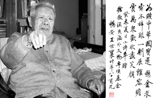 2002年搶救流失海外文物專項基金成立,邀請王世襄先生擔(dān)任顧問,他欣然應(yīng)允。他說,被掠奪的文物,如龍門、云岡石窟被盜掘的文物,應(yīng)該無償追回。這些文物必須歸還回原地,因為他們是土生土長的,根在國內(nèi),是上下相連的。王世襄先生對成立一個以搶救流失文物、保護(hù)文化遺產(chǎn)的公益組織頗感快慰。興奮之余他賦詩一首:為贖中華國寶還、懸金求索不辭艱。一朝展館容瞻賞,萬眾歡欣盡笑顏。