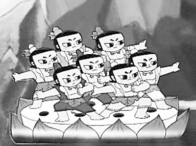 的確,在大多數(shù)人看來(lái),整部《葫蘆兄弟》完全是一個(gè)集體作品。即使胡進(jìn)慶身兼多職參與了《葫蘆兄弟》的導(dǎo)演、編劇和形象設(shè)計(jì)工作,觀眾也很難發(fā)現(xiàn)這一點(diǎn)。在片頭的字幕中,他用了三個(gè)不同的名字,胡進(jìn)慶、進(jìn)慶,還有他的筆名“墨犢”,“不然都是我一個(gè)人的名字,多難看!