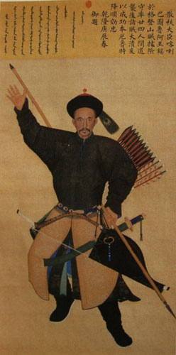 畫作的左上角注明滿文和漢文題贊:“頭等侍衛(wèi)固勇巴圖魯伊薩穆,援兵雖來,畫塹相望,孰騎而呼,為告無恙,維巴圖魯,偕往趣師,其沖賊隊,如分水犀”——勇士的英名、事跡也和勇士的肖像一起懸掛朝堂,詔告天下,永存美譽了。