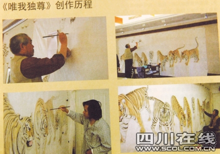 一個小時之后,事情出現(xiàn)了非常戲劇性的變化。不少關于《惟我獨尊》的照片和畫冊在同城某大廈的會議室里出現(xiàn),這里正召開一場關于“打虎”的新聞發(fā)布會,發(fā)布會的發(fā)起人尹青,是畫家孟祥順的好朋友,也是一名成都的律師,這次他是以孟祥順特別代理人的身份緊急約見成都媒體。尹律師義憤填膺地說:“現(xiàn)在正在長江畫院展覽的《惟我獨尊》是百分之百的假貨,