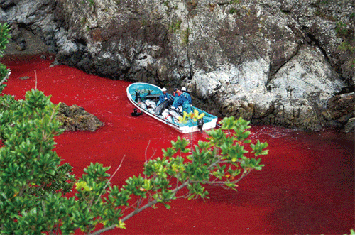 受到驚嚇的海豚在海灣凹口內(nèi)四處游竄,周圍的海水已被海豚的血水染成紅色。有些母海豚為了告知幼海豚有危險(xiǎn)并試圖保護(hù)它們時(shí),往往發(fā)出極度痛苦的鳴叫。絕望的叫聲加上觸目驚心的血水,讓這一幕顯得即凄慘又血腥。