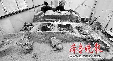 省文物考古研究所所長(zhǎng)鄭同修介紹,車(chē)馬坑及馬坑等重要遺跡整體起取至濟(jì)南后,就采取了初步的防護(hù)措施,建設(shè)了臨時(shí)保護(hù)和工作用房,制定了保護(hù)工作方案。