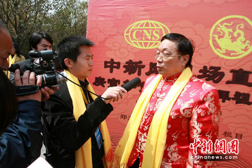 中新網(wǎng)鄭州4月16日電(記者 王中舉)4月16日,庚寅年黃帝故里拜祖大典將在河南新鄭黃帝故里舉行。中國(guó)國(guó)民黨榮譽(yù)主席吳伯雄因故不能前來(lái),特委托中華國(guó)際觀光協(xié)會(huì)理事長(zhǎng)劉宗明先生代表其前來(lái)參加拜祖大典。圖為劉宗明在接受中新社、中新網(wǎng)記者獨(dú)家專(zhuān)訪,并和中新社、中新網(wǎng)領(lǐng)導(dǎo)及記者合影留念。