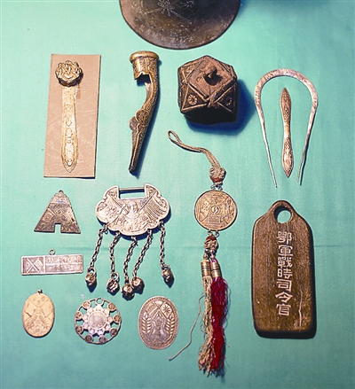 昨日,在其武昌家中,朱漢昌向記者展示了他所收藏的部分繪制有“雙旗”圖案的辛亥紀(jì)念實(shí)物,包括當(dāng)時(shí)的革命將領(lǐng)使用的佩劍手柄、軍政府的出入證、紀(jì)念章、各類佩飾、碗碟等,其材質(zhì)涉及金、銀、銅、鐵、紙、木、瓷、皮、布等。