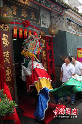 中新網(wǎng)深圳5月6日電(鄭小紅 李海友 鄧小偉)今年5月6日(農(nóng)歷三月廿三)是“中華海神”媽祖誕辰1050周年紀(jì)念日,在中英街,村民們以敲鑼打鼓、舞麒麟、貢祭品、招待八方來(lái)客免費(fèi)品嘗“九簋菜”等流傳已久的民俗方式予以紀(jì)念,中英街關(guān)口排滿了前來(lái)祈福的市民。