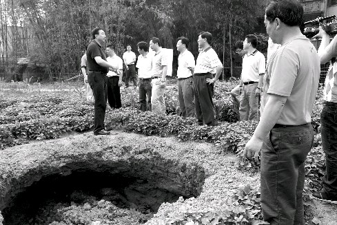 宜賓市長寧縣硐底鎮(zhèn)近日陸續(xù)出現“天坑”,最大的“天坑”直徑4日已經擴大到60米,112戶群眾暫時轉移(本報昨日報道)。昨日,宜賓市委常委、常務副市長徐進率宜賓市國土、安監(jiān)、交通等部門前往硐底鎮(zhèn)進行現場查看。據了解,4日下午,紅旗村再出現一個“天坑”,“天坑”數量目前增至27個。