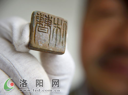 后室西南角的地面上,一方銹跡斑斑的印章赫然“躺”在地上!拔覀儺(dāng)時(shí)激動(dòng)得要命,考古中能得到文字性的東西,簡(jiǎn)直就是驚天發(fā)現(xiàn)!”李光夫笑著說(shuō),當(dāng)時(shí),大家小心翼翼地將印章用密封袋保存,然后給領(lǐng)導(dǎo)打電話“報(bào)喜”。