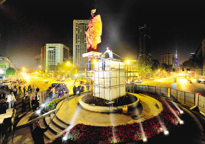 22:30,淮海路、洪武路、王府大街、長江路組成的新街口四環(huán)實施交通管制,新街口大轉(zhuǎn)盤馬上“清凈”下來。22:35,工作人員開始做吊裝前的準備工作,首先是兩臺吊裝機駛近大轉(zhuǎn)盤南北向停放,緊接著工作人員將銅像下的原有基座切割掉后,吊機開始起吊銅像,為了平衡銅像,在銅像的四邊,都有人用繩子進行牽拉,大約23:50銅像吊裝到基座上,工人開始對銅像進行固定……截至記者發(fā)稿時,銅像仍在安放中。