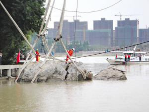 那《瘞鶴銘》疑似巨石的打撈還會繼續(xù)嗎?鎮(zhèn)江文廣新局局長戈矛接受記者采訪時說,打撈還將繼續(xù),但再次打撈的方案,將視江底巨石的探查結(jié)果而定;至于具體何時再啟動打撈,則需要分析和等待。目前,“勇士”號方專業(yè)打撈技術(shù)人員,已經(jīng)開始再次打撈的探查工作。本報記者 萬凌云 文/攝