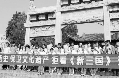 5月29日上午8點,南陽數(shù)百網(wǎng)友還在臥龍崗山門前的“千古人龍”牌坊下,拉起條幅,30名小學(xué)生齊聲誦讀前《出師表》,游人與市民簽名聲援。活動的最后,幾名網(wǎng)友還抬出一臺電視機當(dāng)場砸毀,以示對新《三國》的抗議。