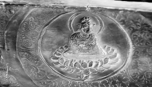 圣物供奉在全國(guó)工藝大師王殿祥親手設(shè)計(jì)制作的楠木刻金寶座上。這兩套楠木刻金寶座直徑有15厘米,高度為12.5厘米,寶座底座和下三層都是浮雕,圖案主要是一些蓮花等佛教紋飾,上面三層是蓮花花瓣。最上面一層采用圓雕手法“綻放”出朵朵蓮花。兩個(gè)寶座采用楠木雕刻,貼附金箔,寶座金光熠熠,莊重而華貴。