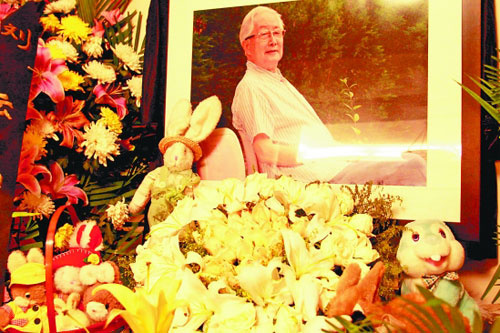 擺放在靈堂上的相片是華老的小兒子華方方在2005年春末拍攝的,就在自家樓下小花壇,一小枝綠色枝條,老人安詳?shù)男δ槪瑲忭嵣鷦?dòng),華老生前看過非常滿意。華老屬兔,他和兔子感情特別深,晚年更成了老小孩,睡床四周是大大小小的卡通兔、絨毛兔,他當(dāng)兔子王。現(xiàn)在這些兔子朋友環(huán)繞著他的遺像,華老一點(diǎn)都不寂寞,有兩只他最心愛的玩具兔還將陪他在墓地到老。