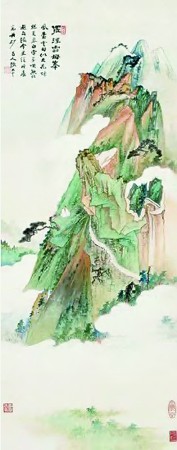 這套《山水二十八條屏》以設(shè)色居多,筆墨酣暢,意境深邃。每畫必題,書體多樣,有大千體、石濤體,還有隸書、篆書。張大千寫大千體或石濤體不乏有之,但張大千寫隸書,尤其寫篆書則屬罕見!渡剿藯l屏》有臨仿,如仿吳鎮(zhèn)、石濤、漸江;有寫生,如《羅浮云母峰》、《羅浮鳳凰谷圖》,多數(shù)為創(chuàng)作。二十八屏懸掛于墻壁,場面之浩大,氣勢之恢弘,極具震撼力。