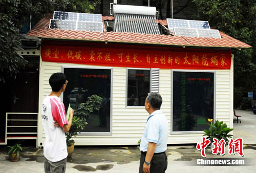 記者看到,這間鋼架結(jié)構(gòu)的房屋功能齊備,雖只有10余平米,但衛(wèi)生間、沐浴間、客廳、臥室一應(yīng)俱全。該房子的主人、退休工程師朱培世告訴記者,房子是由他和團(tuán)隊(duì)成員花了10個(gè)月左右的時(shí)間完成,屋頂上裝有4大塊太陽能板,屋內(nèi)的熱水、通風(fēng)、照明、供暖、甚至降溫都由這幾塊太陽能板提供的能量完成,是一座名副其實(shí)的太能房屋。其方倉建筑、儲(chǔ)冷降溫、太陽供暖、多功能窗、電池支架還獲得國(guó)家專利。