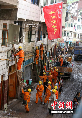 據(jù)成都電業(yè)局抗洪搶險突擊隊負責人鐘守熙介紹,從21日早上6時起,突擊隊就投入到搶修江陵鎮(zhèn)供電系統(tǒng)恢復、戶表換裝工作,經過15個小時的連續(xù)奮戰(zhàn),突擊隊在抗洪搶險的第一天就完成了1000米電纜線的架設,115支戶表的安裝,還有300多戶表的供電恢復將全部在23日結束。