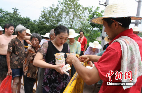 在肖溪鎮(zhèn)民國新街,盒飯供應處也喂?jié)M了人,菜飯飄香。“我們這個安置點的災民共有200多人,全部住在老百姓家里,吃飯由政府統(tǒng)一解決。還設立了開水集中供應點,方便群眾解渴。”