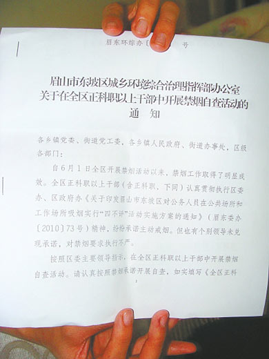 昨日上午,(四川)眉山市東坡區(qū)禁煙行動辦公室(簡稱“治理辦”)工作人員正在起草一份關(guān)于禁煙的文件。文件的題目是《眉山市東坡區(qū)城鄉(xiāng)環(huán)境綜合治理指揮部辦公室關(guān)于在全區(qū)正科職以上干部中開展禁煙自查活動的通知》,包括幾百字的文字和一份禁煙自查表。