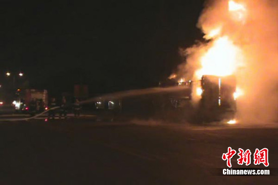 消防隊(duì)員針對現(xiàn)場情況,分別在車的四側(cè)鋪設(shè)水帶架設(shè)水槍陣地用對火進(jìn)行撲救,20分鐘后,大火被撲滅。