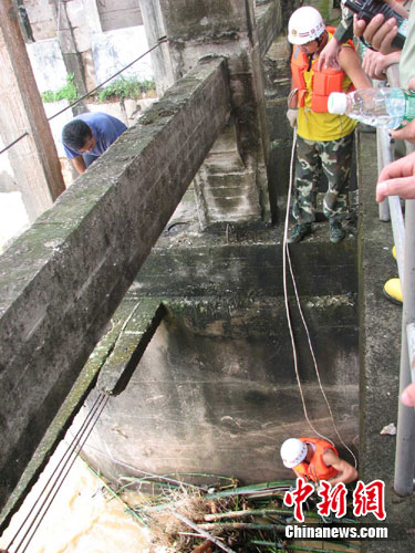 大壩閘門下,水深近6米,水流異常湍急,洪水也異常冰冷,且堆滿了垃圾,雖然消防官兵做好了安全保護(hù),并關(guān)好閘門,下游也安排了漁船隨時準(zhǔn)備救人,但是水下的情況不明,一不小心就有被洪水沖走或被水下雜物扎傷的危險。在其中靠近岸邊的一個孔閘門,大樹與竹子卡在閘門的中間,閘門無法放下,消防官兵只能在異常湍急的水流中作業(yè),由于缺少著力點(diǎn),水下的消防官兵多次沒入水中,險象環(huán)生,經(jīng)過近20多分鐘的作業(yè)才將雜物捆住。