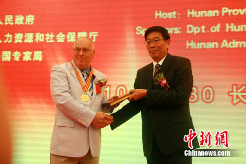 中新網(wǎng)長(zhǎng)沙9月30日電(劉柱 華城)30日,湖南省第五屆“瀟湘友誼獎(jiǎng)”頒獎(jiǎng)儀式暨外國(guó)專家國(guó)慶招待會(huì)在長(zhǎng)沙舉行,來自世界13個(gè)國(guó)家的20位專家榮獲“瀟湘友誼獎(jiǎng)”。湖南省省長(zhǎng)徐守盛致辭并親自為獲獎(jiǎng)專家頒獎(jiǎng)。