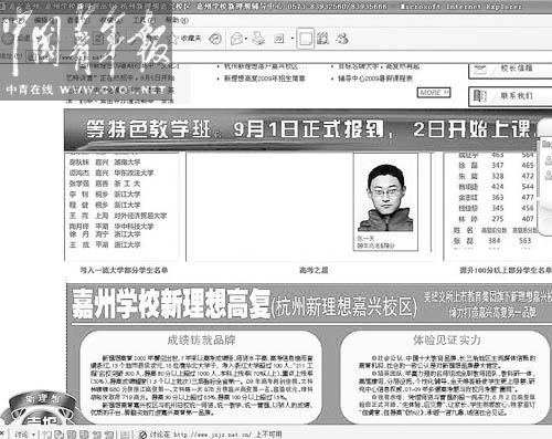 在新理想高復(fù)學(xué)校網(wǎng)站上,還有一篇題為《2007年新理想高考之星》的圖文報(bào)道,這篇報(bào)道稱,2007年新理想再次書寫“高復(fù)傳奇”,有6名同學(xué)有望進(jìn)入清華大學(xué)或北京大學(xué),同時(shí)配有6名“2007年新理想高考之星”的照片。但事后,一名692分的高分理科考生被認(rèn)出是杭州學(xué)軍中學(xué)的應(yīng)屆畢業(yè)生;被提到的688分的朱超,也被指認(rèn)出是杭州高級中學(xué)的理科應(yīng)屆畢業(yè)生。