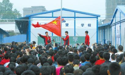 5月6日,蘆山中學(xué)的同學(xué)們?cè)谝呀?jīng)建成的板房教室邊舉行升旗儀式。