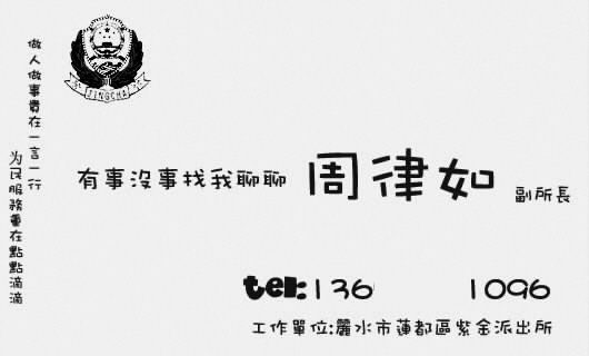 “有事沒(méi)事找我聊聊!睂W(xué)生周律如設(shè)計(jì)的名片上用活潑的美術(shù)大字寫(xiě)了這么一句話(huà),落款是自封的“周律如 副所長(zhǎng)”!昂呛,副所長(zhǎng)當(dāng)然只是假想,不過(guò)我覺(jué)得要多和群眾接觸,才能做好服務(wù)嘛,所以我就這么設(shè)計(jì)啦!”小周說(shuō)。