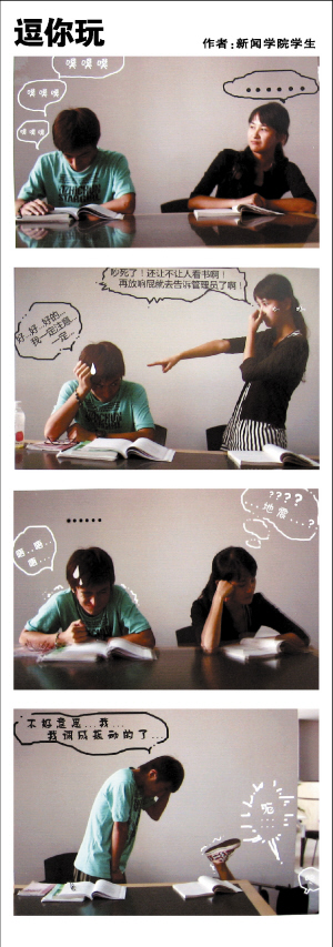 因?yàn)槭堑谝淮闻恼嫒寺,陳遙他們?cè)凇皵[拍”的過程中還碰到了許多好玩的事情,“我們的漫畫是要表現(xiàn)一個(gè)很多人都曾遇到過的難題——在大學(xué)城里,到底是坐公車劃算還是買輛自行車劃算。我們事先設(shè)想了各張圖片的表情動(dòng)作,選景在人多的公車站,比如有一張是要我用很夸張白癡的表情來表現(xiàn)看到塞得滿滿的公車,剛好有一個(gè)女生看到了,以為我在看著她,刷地一下臉就紅了……”