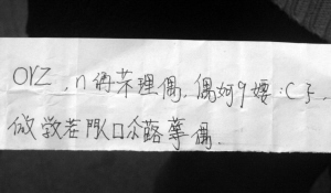 李女士的女兒剛剛上初中,前幾天,她為女兒整理書包的時(shí)候發(fā)現(xiàn)了一張字條:“orz,n侢芣理偶,偶妸9婹:(孒,倣敩茬閄囗尒蕗等偶”,上面大多數(shù)是一些看不懂的字,里面還夾雜了英文字母、數(shù)字和一些符號(hào),很像是“亂碼”。李女士查閱了《康熙字典》和《新華字典》,字典上根本就沒有這些字,尤其是那些符號(hào),怎么看也看不出里面有什么名堂。