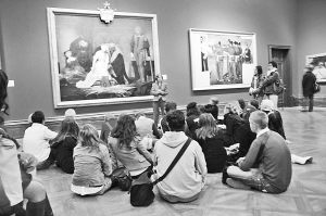 和中國(guó)的情況不同,歐美國(guó)家的中小學(xué)生則把去美術(shù)館視為平常之事,西方人從小就有定期參觀美術(shù)館、博物館等公共文化空間的習(xí)慣,而歐美國(guó)家的美術(shù)館、博物館也把為孩子服務(wù)看作最重要的工作之一。記者曾先后去過(guò)法國(guó)、英國(guó)采訪(fǎng),發(fā)現(xiàn)無(wú)論是法國(guó)的盧浮宮、大皇宮國(guó)家美術(shù)館,還是英國(guó)的大英博物館、國(guó)家畫(huà)廊,到處都可以看到孩子的身影,而且不少是由學(xué)校組織帶隊(duì)參觀,甚至還有一些老師直接在美術(shù)館里為學(xué)生上課。