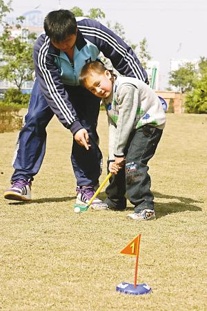 “我揮了半天,終于進(jìn)洞了!10名二年級的小學(xué)生正在體育教師李科的帶領(lǐng)下進(jìn)行高爾夫球訓(xùn)練。這些孩子拿的高爾夫球桿是一根大約長30厘米的塑料桿,另外還有15個紅、藍(lán)色球洞分置在草坪四周。