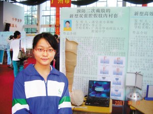 隨后,潘瑩的假肢內(nèi)襯墊獲得第五屆廣東省少年兒童發(fā)明獎一等獎,08年4月獲得第二十三屆廣東省青少年科技創(chuàng)新大賽金獎,F(xiàn)在,在廣東省青少年科技創(chuàng)新大賽組委會的支持下,她的產(chǎn)品申請了專利,現(xiàn)處于臨床測試中。