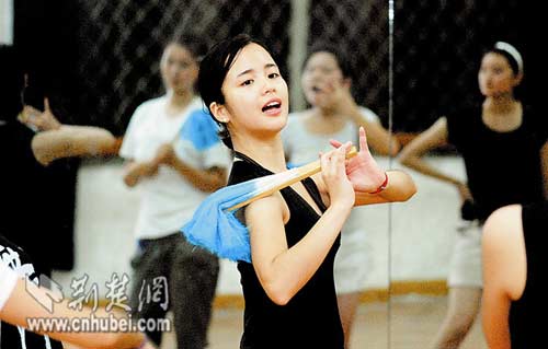彎腰,擺頭,腳尖點(diǎn)地,滑步……伴著古意濃濃的音樂(lè),七名女孩翩翩起舞,優(yōu)美的身姿讓人的目光不禁久久停留!斑@不是‘魔女幼熙’么?”記者眼前一亮:領(lǐng)舞者長(zhǎng)相頗似熱播韓劇《魔女幼熙》的主角。隨意的小卷發(fā)披在肩頭,忽閃忽閃的長(zhǎng)睫毛下,大眼睛顧盼生輝,這個(gè)“魔女幼熙”名叫黃蓓,武大新聞與傳播學(xué)院大三學(xué)生。每晚給一群將參加“藝考”的高中生上舞蹈課,是她這個(gè)暑假的兼職工作!翱辞宄,像我這樣,兩手伸直,腰一定要用力彎下去……”從學(xué)生的熱身準(zhǔn)備,到舞蹈中的每個(gè)細(xì)節(jié)乃至眼神,黃蓓都頗為專(zhuān)業(yè)地逐個(gè)糾正。兩小時(shí)的教學(xué)時(shí)間里,她說(shuō)得最多的一句話是“再來(lái)一遍”。在幫助學(xué)生做拉伸動(dòng)作時(shí),有的初學(xué)者疼得哇哇叫,她也毫不心軟,“怕疼是學(xué)不好舞蹈的!