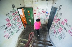 在南秀村居住了40年的吳大爺告訴記者,他沒事就用乳膠漆在樓道內刷刷補補,但通常情況都是,蓋上一層沒多久就又添“新衣”,甚至連樓梯扶手都不放過。一位居民更氣憤,有一次他們家的水電催繳單貼在樓道里,沒多久就被小廣告淹沒,自己只好為此搭上許多滯納金。