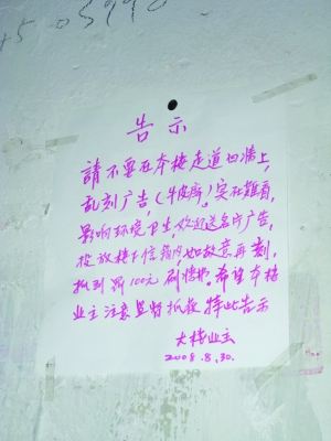 “請不要在本樓走道墻上亂刻廣告(牛皮癬)……如故意再刻,抓到罰100元,刷墻面!痹诙䲢l巷小區(qū)41號4單元一樓,記者看到了這樣的告示,貼在一面剛剛被重新粉刷過的墻上。爬上二樓樓道,這面墻也留著剛剛被粉刷過的痕跡,黑體大字書寫的“告示”格外醒目。