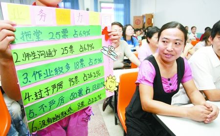 “學(xué)生的眼真毒!太嚴厲、拖堂、扔粉筆頭,好像我可以對號入座啦!”根據(jù)學(xué)生羅列的一堆毛病,一位女老師大吃一驚!捌綍r,我真沒發(fā)現(xiàn)自己多厲害,現(xiàn)在聽你們一說,真覺得有時不該發(fā)火。”二年級語文老師樊偉說。