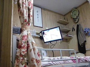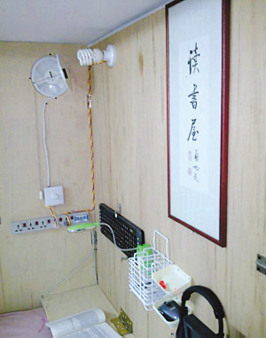 從論壇發(fā)布的照片上可以看到,三張木板及花色窗簾構(gòu)造了一個豐富的私人空間(圖一)。內(nèi)有照明、電腦及空氣循環(huán)設(shè)備,可伸縮的電腦屏幕和可隨時收合的寫字臺,鍵盤、鼠標(biāo)和耳機掛在墻上(圖二),使用的時候只要旋動一個旋鈕,東西就可以拿下來在任何地點使用。這個狹小的空間內(nèi)還有三層木架,可放生活用品(圖三)。最吸引人注目的是該男生還在床頭掛了一幅墨寶——“讀書屋”。給人的總體感覺是,這是一個富有創(chuàng)意又勤奮好學(xué)的學(xué)生。