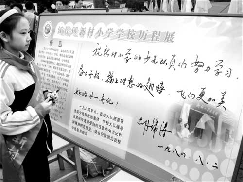 昨天,在活動(dòng)現(xiàn)場(chǎng),眾多市民、學(xué)生在題詞前駐足觀看,他們說,現(xiàn)在看到胡主席當(dāng)年的題詞,非常親切。新村小學(xué)負(fù)責(zé)人告訴記者,胡主席的題詞是全校師生努力奮斗的動(dòng)力和目標(biāo)。