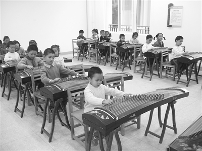 11 月13日,記者在漢陽玫瑰園小學(xué)南國(guó)明珠校區(qū)古箏室看到:一年級(jí)一班31個(gè)孩子(包括17名男生),在專聘老師的指導(dǎo)下,有模有樣彈著古箏。音樂老師指著坐窗口的一個(gè)小男生介紹說:“他叫小杰,可以說是最調(diào)皮的孩子了,但只要一上古箏課他就特別安靜而且好學(xué),他都能完整彈好幾首曲子了呢!”