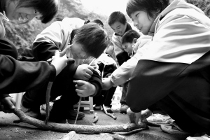 學(xué)生在體驗(yàn)鉆木取火。
