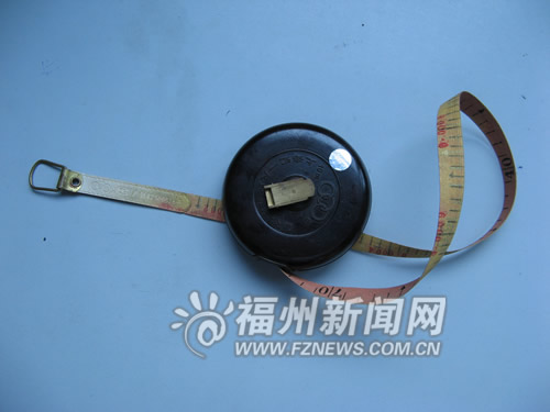 這尺為皮帶型的布帶尺,全長50米。尺的正面為黃色,刻度為米,稱為黃尺;背面為紅色,刻度為“毫”,稱為紅尺。