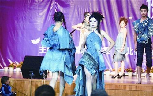 該隊領(lǐng)隊夏冬桔介紹,10套參賽服裝是他們用70多件廢舊牛仔服,在設(shè)計師的指導(dǎo)下花5天時間撕碎重新拼接,一針一線縫制而成的。廢舊牛仔服由全校同學(xué)捐出,是他們破舊了不再穿了的衣服。