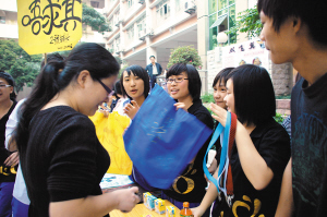 據(jù)了解,今年“搞搞新意思”的地方在于,老師也成為檔主,教導(dǎo)處5個(gè)老師注資一千多元開一個(gè)“雙飛翼”檔,所賣雞翅都是一位客家籍貫的老師以30幾元一包的價(jià)格從家鄉(xiāng)處買來的,而海報(bào)也是美術(shù)老師畫的。譚娟娟老師表示,所賺到的錢將捐給關(guān)工委幫扶小組和校內(nèi)有困難的同學(xué),“加入了慈善的因素,有不少學(xué)生并不是真的喜歡吃,是為了幫助人才來‘幫襯’,這體現(xiàn)了他們的愛心,而且老師跟學(xué)生一起參與,體現(xiàn)平等。