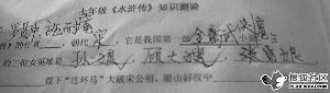 發(fā)帖者稱:最近在中學(xué)見習(xí),趕上學(xué)校在考關(guān)于《水滸傳》文學(xué)常識(shí)的卷子。幫老師批卷子的時(shí)候,孩子們超級(jí)富有想象力的答案囧翻了我們一屋子人。