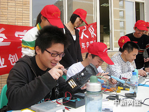 4月26日,浙江紡織服裝職業(yè)技術(shù)學院大學生就業(yè)創(chuàng)業(yè)協(xié)會組建青年志愿隊,和寧波大學理學院家電維修社聯(lián)合開展維修小家電活動。他們在校園內(nèi)設(shè)攤,用一天時間免費為同學們修理電風扇、電吹風、MP3等各種小家電200余件。