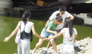 昨天上午9:00,大胡同附近的河邊傳來尖叫聲。循著聲音望去,只見河邊站著三名女孩,其中一名穿綠色T恤的女孩最靠近河水!皠e過來,你們?cè)僮咭徊轿揖拖潞印!闭f著,女孩把一只腳踩進(jìn)水里,另外兩人見狀,只好停下腳步。幾個(gè)好心路人見狀趕緊拿出手機(jī)要報(bào)警,就在這時(shí),幾名男女青年攔住了要報(bào)警的人。他們稱站在河邊的三個(gè)女孩都是他們的同伴,她們是在“演戲”,不會(huì)真的輕生,聽到這兒眾人才算放心。