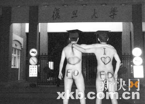 昨日,一條名為《復(fù)旦學(xué)生裸奔慶祝畢業(yè)》的圖文帖,火遍貓撲、天涯、華聲、網(wǎng)易等論壇。在貼出的圖片中,兩名男生頭戴學(xué)士帽,裸體在復(fù)旦校園內(nèi)奔走,并在學(xué)校大門、校訓(xùn)等多個(gè)地方留影。在網(wǎng)帖中,發(fā)帖者并未對(duì)兩名男生作介紹,但從其中一名男生在復(fù)旦的“恒隆物理樓”留影來看,網(wǎng)友們認(rèn)為這兩名男生應(yīng)該是復(fù)旦物理系的畢業(yè)生。